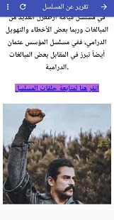 حيث يعرض التطبيق تقرير عن مسلسل المؤسس عثمان ويعرض ايضا تتر مسلسل عثمان المؤسس للموسم الثاني وكما يوجد بداخل التطبيق حلقات المسلسل من بداية عرض الموسم الثاني للمسلسل التركي المؤسس عثمان ارطغرل