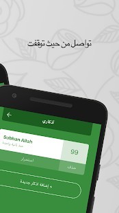يمكن تخصيص واجهة التطبيق وفقًا لعادات الاستخدام. لسهولة الوصول، يمكنك تلقي تنبيهات مسموعة وتهتز عند كل نقرة. بهذه الطريقة لا تحتاج إلى إلقاء نظرة على شاشة الهاتف أثناء التسبيح. يمكنك أيضًا التسبيح عن طريق لمس أي منطقة من الشاشة بفضل "Smart Touch". التطبيق متاح أيضًا بألوان مختلفة ، ويتميز أيضًا بالوضع الليلي. بفضل ميزة الوضع الليلي ، فإنه يوفر استهلاك البطارية ويخلق تخطيط شاشة مريح يجعل العيون أقل تعبًا للاستخدام على المدى الطويل.