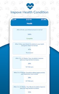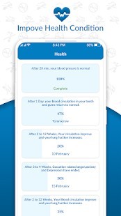 يوفر التطبيق قسم "أسبابي للإقلاع عن التدخين" وهو أحد أكثر الأقسام فائدة أثناء الرغبة في الإقلاع عن التدخين وتريد تشتيت انتباهك. في هذا القسم ، يمكنك إضافة أسباب رغبتك في التوقف عن الإقلاع ، ويمكنك أيضًا تعديل نفس السبب. بعد أن تشعر بأن السبب غير مستخدم ، يمكنك حذف السبب أو إضافة سبب جديد. تصف علامة التبويب الصحية التغيرات التدريجية في ضغط الدم وانخفاض معدل ضربات القلب بالنسبة المئوية. يساعد على معرفة مستوى أول أكسيد الكربون في الدم. تشكل النوبة القلبية خطراً كبيراً في الوقت الحاضر ، وهذا التطبيق يوضح فرص حدوث انخفاض في النوبة القلبية عن طريق الإقلاع عن التدخين. يصف هذا التطبيق أيضًا إعادة القدرة على الاختبار والشم في يومين.