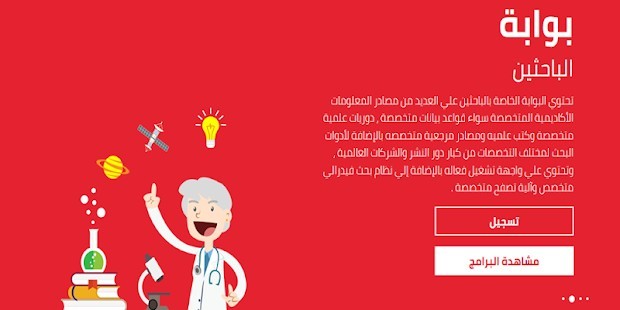 بالنسبة للبوابة الخاصة بالباحثين فهي تحتوي علي أحدث ما وصل إليه العلم من إكتشافات من أكبر دور النشر العالمية وأعرق الجمعيات البحثية الغير هادفة للربح حيث تحتوي علي آلاف الدوريات العلمية المتخصصة ذات معاملات التآثير المرتفعه في المجالات البحثية المختلفة بالإضافة إلي مئات الآلاف من الكتب والمراجع العامة والمتخصصة وكذلك قواعد البيانات والأدوات البحثية المتخصصه وتشمل أيضاً موسوعة بريتانيكا الأكاديميه وديسكفري التعليميه ، فضلاً عن نظام البحث الموحد الذي يتميز بالدقه ومرونة الإستخدام ونظام التصفح الموضوعي لكافة التخصصات