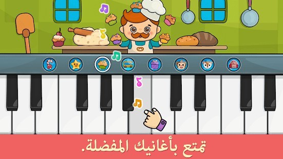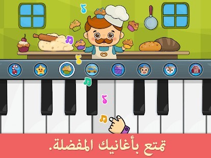 آلات موسيقية للأطفال الصغار. يمكن للأطفال استخدام مجموعة متنوعة من الآلات الموسيقية، مثل: البيانو، والطبل، والأجراس، والغيتار، والمزمار، والبوق، والدف والهارومنيكا. ويحتوي التطبيق على رسوم متحركة جميلة تجسد شخصيات مثيرة تضمن تجربة مميزة للأطفال من عمر 2 – 5.