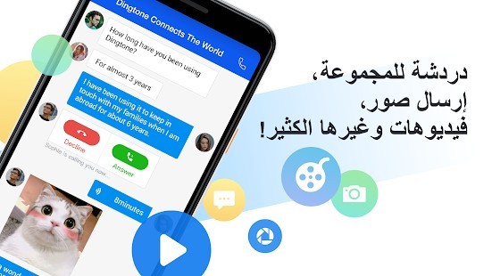 نقدم لكم Dingtone، الطريقة الجديدة للتحدث و ارسال الرسائل و المشاركة مجانا! يمكنكم من خلال استخدام Dingtone القيام بمكالمات مجانية، إرسال رسائل نصية مجانية، مشاركة الصور، استخدام خاصية الواكي تاكي مثل خاصية اضغط للتحدث، ترك بريد صوتي و عمل مكالمات جماعية.