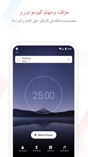 "Focus to do" تقنية تجمع بين مؤقت البومودورو وادارة المهام، هي تقنية مبنية على أبحاث ودراسات سيحفزك على الاستمرار في التركيز وإنجاز الأمور - التطبيق يجمع بين تقنية pomodoro و to do list يمكنك تنظيم المهام في قوائم المهام الخاصة بك , ضبط المؤقت و التركيز على العمل والدراسة , كما يمكن أيضا تفعيل خاصية تذكيرات للمهام المهمة ، والتحقق من الوقت الذي تقضيه في العمل.