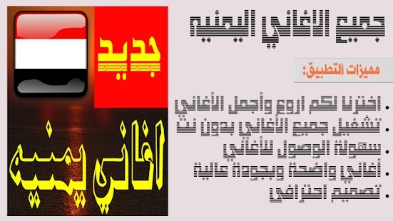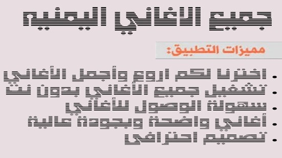 نقدم اليكم تطبيق اجمل وافضل اغاني يمنية بدون نت فمرحبا بكم في هذا التطبيق الجديد المتقن التصميم و الرائع الذى سيبهركم بالمحتوى الذي وضعناة فيه حيث ستجدون احلى اغاني يمنية بدون نت بصورة جديدة ورائعة فبواسطه هذا التطبيق الرائع الذى يحتوى على قائمه من اجمل واحدث , اغاني يمنية بدون نت , اغاني ردح و اغاني دبكات , ردح و دبكات, اغاني مصرية بدون نت , اغاني شبابية بدون نت الى عشاق اغاني يمنية بدون نت شعبي انتم على موعد مع اغاني قديمة و شيلات اعراس خطيرة لاغاني عراقية بدون نت ، لا ننسى أيضا أغاني ردح و الدبكات العراقية المعروفة اغاني يمنيه بدون نت ، و جلسات العود أيضا.
