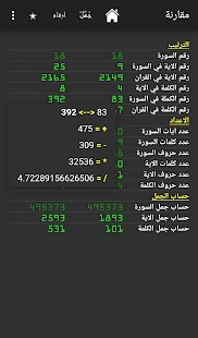 ـ البحث في القرأن عن الايات و الكلمات المطابقة لعدد معين ـ برمجة حساب جمل خاص ـ احصائيات الايات و الكلمات القرأنية (الترتيب, الاعداد و حساب الجمل) ـ القرأن بالارقام ـ حفظ الايات و الكلمات المفضلة ـ مقارنة الايات و الكلمات ـ قواسم الاعداد