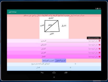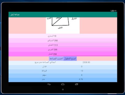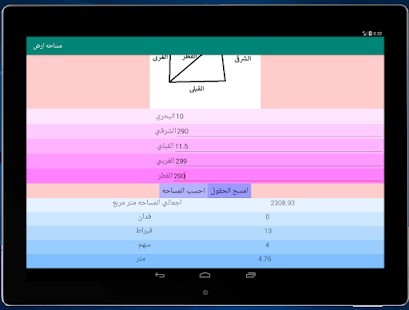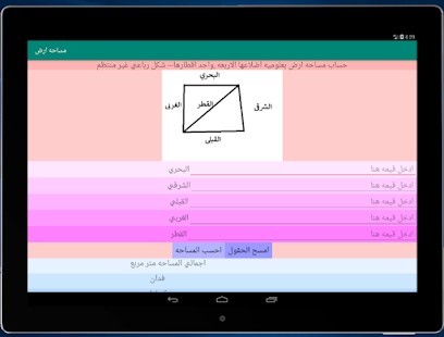 برنامج بسيط لحساب مساحه الارض فقط قم بقياس حدود الارض الاربعه واحد اقطار الارض ثم ادخل البيانات الي البرنامج ليقوم بحساب اجملس المساحه بالمتر المربع ثم يقسمها الي افدنه وقراريط واسهم ومتر متر