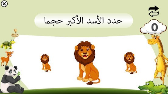 👈 لعبة أحجام أطوال أوزان (تعليم الاحجام للاطفال): والتي تنتج للطفل أسئلة عشوائية متنوعة يظهر فيها ثلاث صور وعلى الطفل اختيار الصورة الصحيحة حسب السؤال. مثال: اختر الأسد الأكبر حجما، ذلك يسهل كثيرا تعليم الاحجام للاطفال وكذلك تعليم المقارنات.