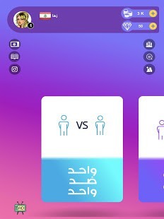 .لعبة اسم انسان حيوان نبات جماد بلاد كثيرا ما لعبناها ايام الدراسة وايام الجمعة الحلوة قمنا بتطوير اللعبة واضافة اللعب الجماعي واضافة شات ايضا , يوجد بها ١ مقابل ١ و ٤ لاعبين ضد بعض وايضا طاولة خاصة لدعوة الأصدقاء , تقدر تختار شخصيتك اللي تعجبك , هناك الكثير من المنافسين داخل اللعبة ...