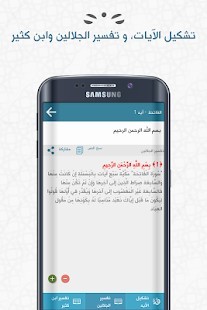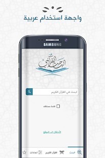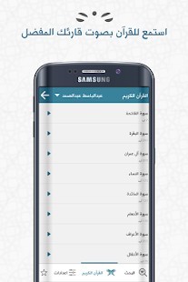 2- الاستماع الى القرآن الكريم حيث يتوفر الباحث القرآني على 14 قارئ يمكنك التغيير بينهم و ايضاً عند الاستماع الى السورة المطلوبة يتم حفظها في الجهاز والعود اليها في وقت لاحق في حالة عدم وجود اتصال انترنت.