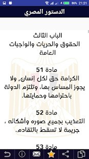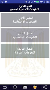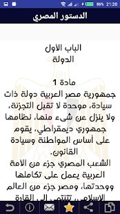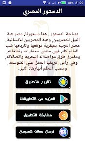 مرحباً بكم نقدم لكم تطبيق جديد وهو عبارة عن جميع مواد الدستور المصري الجديد كامل بشكل بسيط ومرتب مع العديد من المميزات مثل نسخ مواد الدستور ومشاركتها علي مواقع التواصل الاجتماعي التطبيق مقسم الي 6 ابواب رئيسية ويليه الاقسام الفرعية ويليه المواد بحيث ييسر علي القارئ الوصول الي أي مادة يريدها بسهولة .عن الدستور المصري بسم الله الرحمن الرحيم هذا دستورنا مصر هبة النيل للمصريين، وهبة المصريين للإنسانية.