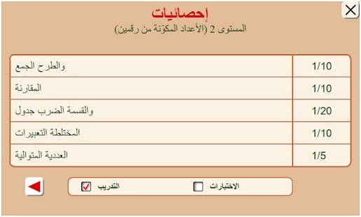 اللوحة يشير إلى عدد من التمارين على المستوى الحالي و عدد الإجابات الصحيحة والخاطئة.
