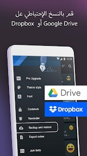 ☁️ المزامنة مع Dropbox / Google Drive والنسخ الإحتياطي: قم بعمل النسخ الإحتياطي للمفكرة وتجنب فقدانها. استخدم المزامنة مع دروبوكس لنقل ملاحاظاتك لجهاز آخر أو استعادته في حال فقدانها.