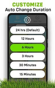 ضبط المؤقت ، تغيير المدة - يمكنك ضبط المدة الزمنية التي تريد بعدها تغيير الخلفيات تلقائيًا على شاشة هاتفك المحمول. الإعداد الافتراضي للمؤقت هو 24 ساعة ، ولكن يمكنك تحديد 12 ساعة و 6 ساعات و 3 ساعات و 1 ساعة و 30 دقيقة و 15 دقيقة و 5 دقائق و 1 دقيقة وما إلى ذلك. بمجرد تنشيط Auto Wallpaper Changer ، يمكنك تغيير مدة المؤقت في أي وقت من خلال قائمة الإعدادات. يمكنك أيضًا تمكين / تعطيل ميزة Auto Wallpaper Changer من قائمة الإعدادات.