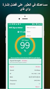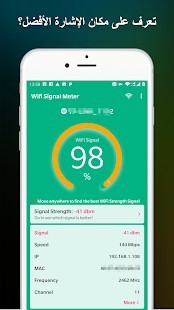 من الأفضل أن تكون قوة إشارة WiFi أعلى من 60٪.واي فاي إشارة قوة متر - واي فاي الماسح الضوئي الضوئي يمكن عرض قوة إشارة واي فاي الحالية والكشف عن قوة إشارة واي فاي من حولك في الوقت الحقيقي.واي فاي إشارة قوة متر - واي فاي الماسح الضوئي الضوئي يمكن أن تساعدك على العثور على البقع الحلوة في شبكة واي فاي الخاصة بك.واي فاي إشارة قوة متر - واي فاي الماسح الضوئي هو أداة بسيطة تسمح لك بعرض قوة إشارة WiFi الحالية.واي فاي إشارة قوة متر - واي فاي الماسح الضوئي مفيد في العثور على مناطق جيدة من الاتصال بالواي فاي في شبكة الواي فاي الخاصة بك.واي فاي إشارة قوة متر - واي فاي الماسح الضوئي الضوئي يمكن بسرعة التحقق من قوة واي فاي الخاص بك للعثور على أفضل موقع.واي فاي إشارة قوة متر - واي فاي الماسح الضوئي بتحديث قوة الإشارة باستمرار حتى تتمكن من التجول في المنزل أو العمل أو أي مكان للعثور على أفضل إشارة WiFi.ملحوظة:يمكن أن تتسبب قوة إشارة WiFi الأقل من 50٪ في حدوث مشكلات في الفصل.