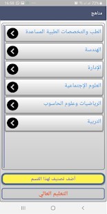 بالنسبة لمناهج التعليم العالي والمناهج المهنية، فقد تم تصنيفها لتصنيفات رئيسية مثل "الهندسة" وتصنيفات فرعية مثل "هندسة الكهرباء" ومن ثم تأتي قائمة المواد التي تندرج تحت التخصصات الفرعية.
