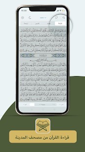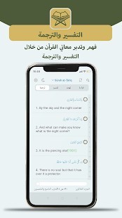 • القراءة في المصحف: يتيح التطبيق طريقتين لعرض الآيات، الأولى هي الطريقة العادية في قراءة صفحة المصحف، والثانية هي عرض كل آية وتحتها التفسير أو الترجمة الخاصة بها.