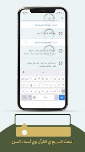 • البحث: يستطيع المستخدم البحث عن كلمات معينة في المصحف الشريف وأسماء السور، فتظهر له نتائج البحث مرتبة بترتيب ورودها في المصحف، ويتم تخزين سوابق البحث الأخيرة ليمكن الوصول إلى النتائج بشكل سريع.