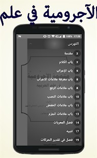 • بمجرد فتح قائمة التصفح في تطبيق متممة الآجرومية في علم العربية يظهر لك الباب المفتوح حاليا بخلفية داكنة.