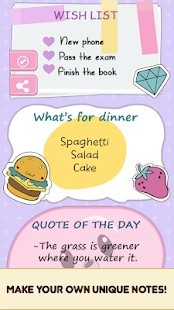 إذا نسيت الأشياء بسهولة ، فهذا "تطبيق ملاحظات" هو وسيلة مثالية لمساعدتك على القيام بكل ما تحتاج إليه. تحقق من العناصر الموجودة على قائمة التحقق من الملاحظات الملصقة واحدة تلو الأخرى أثناء إكمال جميع مهامك ، واستمتع بوقتك الحر! لا يجب عليك وضع ملاحظات لاصقة في دفتر الملاحظات والمخططين ، وضعها على شاشة هاتفك وسوف تراها بسهولة. تطبيق قائمة التحقق البسيطة ، ولكن العملية ستكون مفيدة للغاية عندما تذهب للتسوق أو القيام بالمهام المدرسية. ⭐ ورق ملاحظات: كتابة مذكرة القطعة ⭐ التطبيق هو وسيلة رائعة لتتبع جميع المهام الخاصة بك مع أرقى الألوان والخلفيات المخصصة لجميع الملاحظات الخاصة بك ، فإنه على حد سواء العملي والجميل ، فقط ما تحتاجه!