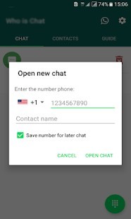 لا يتم إنشاء أي جهة اتصال على الجهاز ، لذلك لا تحتاج إلى حفظ الرقم في قائمة جهات الاتصال الخاصة بك من أجل فتح الدردشة. ببساطة فتح التطبيق ، أدخل الرقم ، انقر فوق الزر وسيتم فتح الدردشة (إذا كان الرقم موجود ، وإلا سوف Whatsapp إخطار ذلك).