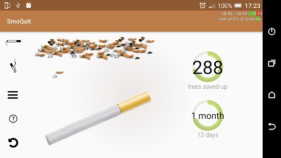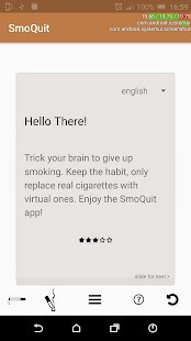 يريد هذا التطبيق تحدي طريقة الإقلاع عن التدخين عن طريق استبدال السجائر الحقيقية بأخرى محاكاة ، والتي تستغرق نفس الوقت الذي تستغرقه السيجارة الحقيقية في "التدخين". يمكنك تتبع عدد السجائر الحقيقية التي استبدلت بأخرى محاكاة ، ولن تضطر إلى التخلي عن فترات التوقف عن التدخين.