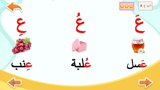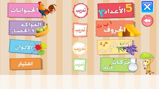 ا - ب - ت - ث - ج - ح -خ ... لكل حرف صورة مع النطق لحيوان ونبات وجماد الحرف اول الكلمة وسط الكلمة اخر الكلمة يحتوي التطبيق أيضا اشكال الحروف حركات الحروف تعرف على الحروف العربية الهجائية بالصوت والصورة يحتوي التطبيق أيضا كتابة الاحرف تعليم الأرقام تدريبات على الأحرف والأرقام الحيوانات مع اصواتها الفواكه والخضار الألوان اختبار شامل للحروف نطق سليم باللغة العربية الفصحى
