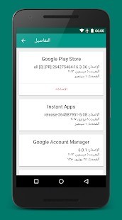 يعرض رقم الإصدار وتاريخ التثبيت وتاريخ آخر تحديث. كما يوفر روابط إلى متجر Play Store ومذكرات إصدار المطور وحوار معلومات التطبيق.
