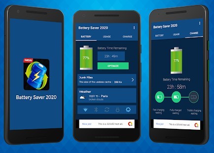 Battery Saver 2020 يجعل بطارية المحمول تدوم لفترة أطول! مع أوضاع إدارة طاقة البطارية المحددة مسبقًا. مميزات توفير طاقة البطارية وتسريع الشحن:تحسين البطاريةتحليل & إزالة الملفات غير المرغوب فيه..Live الطقسالوقت البطارية المتبقيةتبديل .WiFi / Data / Bluetooth..سيطرة سطوع..حفظ الطاقة وقتل المهام بنقرة واحدة..قتل التطبيقات عند إيقاف تشغيل الشاشة.بطارية دقيقة الوقت المتبقي..توفير أوضاع توفير الطاقة لـ (فئة العمل-النوم) وأكثر من ذلك.فريد ثلاث مراحل نظام الشحن..